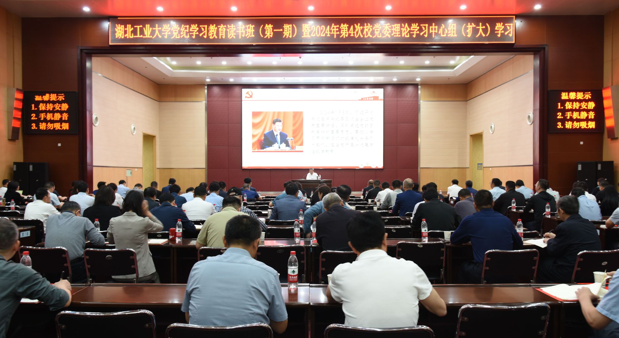为深入贯彻落实中央、省委关于党纪学习教育有关部署要求,4月24日上午,学校在图书馆报告厅组织党纪学习教育读书班(第一期)暨2024年第4次校党委理论学习中心组(扩大)学习,原原本本学习《中国共产党纪律处分条例》(以下简称《条例》)。校党委书记彭育园作辅导报告,在校校领导、党委常委,全校正、副处级领导干部参加了学习。